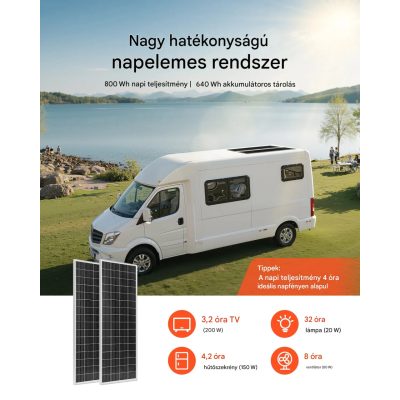 A rendszer 2 darab 100W-os monokristályos napelemet tartalmaz, amelyek hatékony energiatermelést biztosítanak még változó fényviszonyok mellett is. A modern cellatechnológia hosszú élettartamot és megbízható működést garantál.