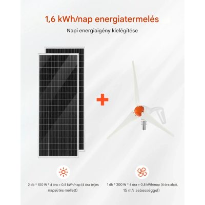 A csomag tartalmaz 2 db 100 W-os monokristályos napelemet, valamint egy 200 W-os szélturbinát, amelyek együtt biztosítják az egyenletes energiaellátást. A fejlett MPPT hibrid vezérlő intelligensen kezeli a két energiaforrást, optimalizálja a töltést, és védi az akkumulátort a túlterheléstől vagy a mélykisüléstől.