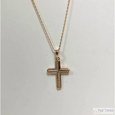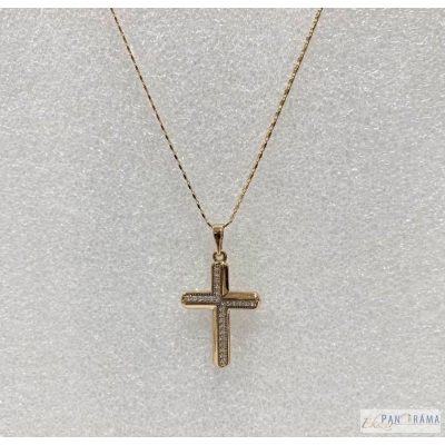 Arany színű kereszt medál, közepe ezüstösen csillogó tűkristályokkal tarkított. Nyaklánccal remek kiegészítője lehet öltözékünknek.