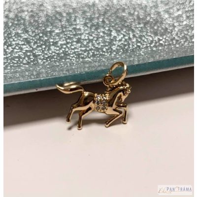 Nyereg helyén apró fehér tűkristályokkal díszített arany színű vágtató ló alakú medál, amit bármelyik korosztály viselhet!.