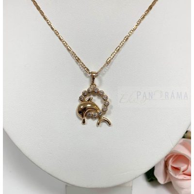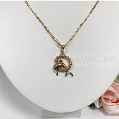 Arany színű medálos nyaklánc, a medál közepében egy delfin egy csillogó kristály karikával. Kifinomult, egyben mutatós darab.