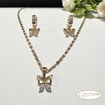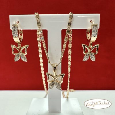 Medálos nyaklánc, kapcsos, lógós fülbevalóval pillangó motívummal.