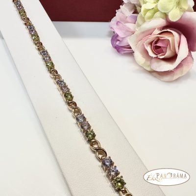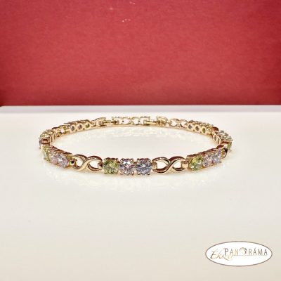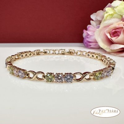 18K Gold Filled, antiallergén arany színű karkötő, színes kristályokkal díszítve.