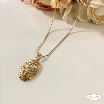 Arany színű, mutatós ékszer, apró kristályokkal kirakott ovális alakú medál.
