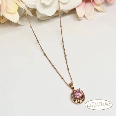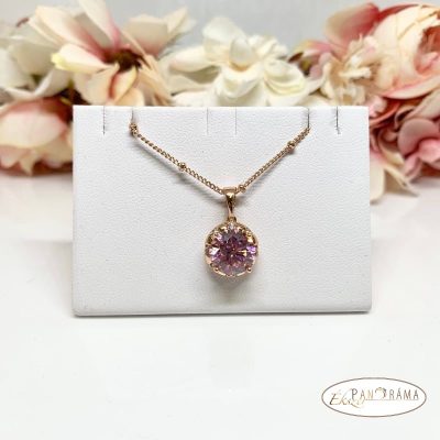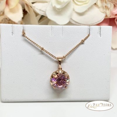 Arany színű, mutatós ékszer, csodásan csillogó rózsaszín kristályos medállal.