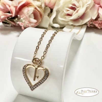 18K Gold Filled antiallergén, nikkelmentes nyaklánc, szív alakú medállal, a közepében kulccsal.