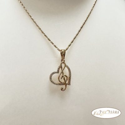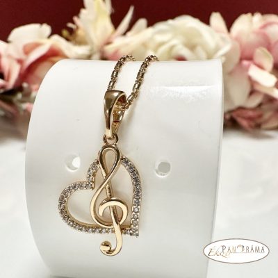 18K Gold Filled antiallergén, nikkelmentes nyaklánc, szív alakú medállal, benne violin kulcs díszítéssel.