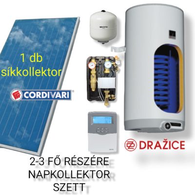 • 2-3 fő részére síkkollektoros szett HMV készítés: 1 síkkollektor + 100 literes hőcserélős bojler + ECO szivattyú állomás + vezérlés + tágulási tartály