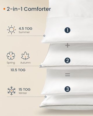 【EGÉSZ ÉVES KÉNYELEM】Ez a szett 2 paplant tartalmaz. Használja a 4,5 TOG könnyű paplant a hűvös nyári éjszakákhoz, a 10,5 TOG nehezebb paplant a kényelmes tavaszi és őszi pihenéshez, vagy kombinálja őket a maximális téli melegségért. Tökéletes kényelem minden évszakban!