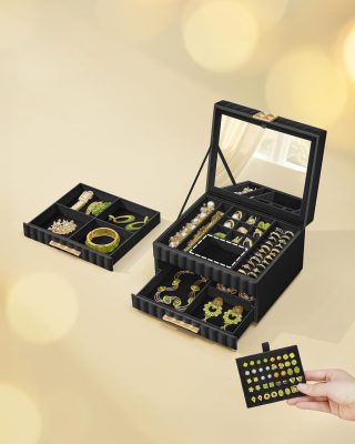 3 szintes ékszerdoboz tükörrel, ékszertartó 2 fiókkal, fekete
