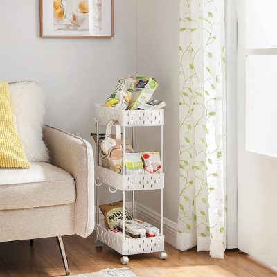 Songmics 3 szintes konyhai kocsi süllyesztett polc kerekeken Fürdőszoba polc 6 kivehető kampóval Kis tálcával és tárolóval a nappaliba 38 x 72 x 22 cm , fehér