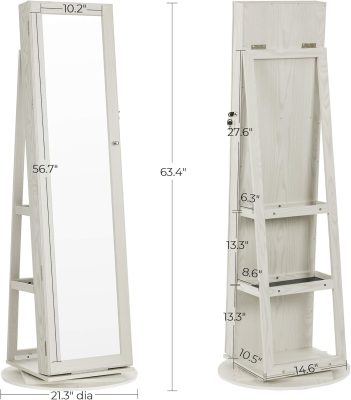 360°-ban forgatható ékszerszekrény, teljes alakos tükörrel, zárható ékszertároló, fehér