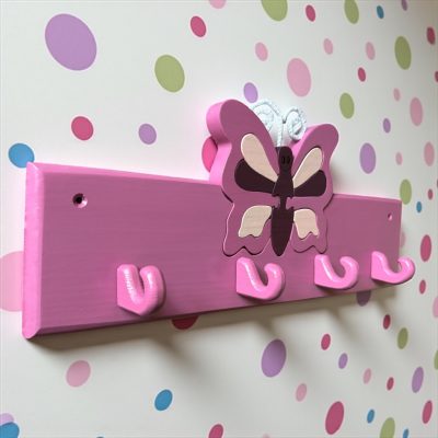 • 4 akasztós gyermek fogas, fából , bevágott dísszel - lila pillangó