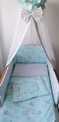 A babaágynemű szett tartalma takaró- és párna huzat, rácsvédő, baldachin
