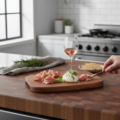 fa nyelű evőeszközökkel és borospoharakkal. Egy pohár vörösbor, néhány sajt és sonka szelet – és máris készen állsz egy stílusos borkóstoló estére!