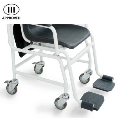 A négy keréknek köszönhetően, amelyek közül kettő fékkel van felszerelve, ez a székmérleg minden erőfeszítés nélkül mozgatható. Az összecsukható lábtartók problémamentes hozzáférést biztosítanak a beteg számára.