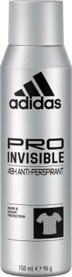 Az adidas Pro Invisible izzadásgátló dezodor 48 órás védelmet nyújt a nedvesség és a testszagok ellen. A formula megakadályozza a fehér és sárga foltok kialakulását, és gondoskodik arról, hogy még a fekete és fehér ruhák is foltmentesek legyenek. A friss, mégis meleg illat bőrös és fás jegyekkel gondoskodik a második bőr érzetről. A formula bőrgyógyászatilag tesztelt, vegán és alkoholmentes.