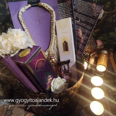Ékszer és parfüm kedvelők figyelmébe ajánjluk ezt a különleges ajándékcsomagot, mely lila, arany és krém színekben pompázik. Ízlésesen összeválogatott tárgyak, minőségi díszdobozban.