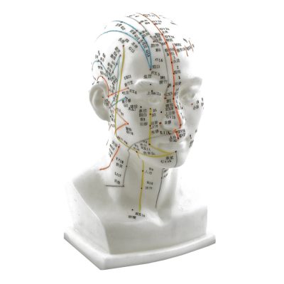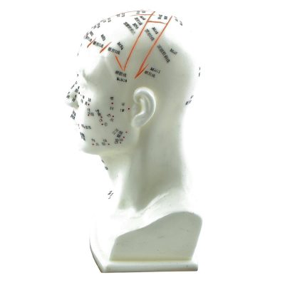 Az emberi fej akupunktúrás pontjainak és meridiánjainak egyértelmű ábrázolását kínálja.