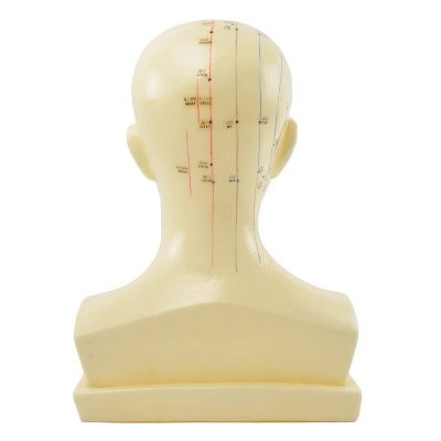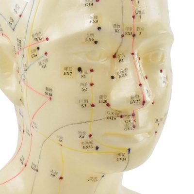 Az emberi fej életnagyságú akupunktúrás modellje puha PVC-ből, amelyen az összes meridián és akupunktúrás pont látható.