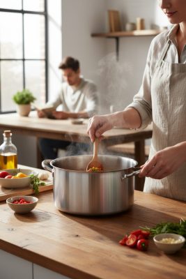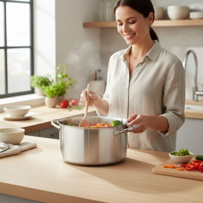 A De Buyer PRIM'APPETY 28 cm-es rozsdamentes acél alacsony lábas prémium minőségű AISI 304 rozsdamentes acélból készült, amely egyenletes hőeloszlást és tartósságot biztosít. A szendvicstalp lehetővé teszi az indukciós főzőlapokkal való kompatibilitást és az egyenletes hőelosztást az edény alján. Az ergonomikus, több ponton hegesztett rozsdamentes acél fogantyúk kényelmes fogást és biztonságos használatot nyújtanak. Mosogatógépben is tisztítható, alkalmas minden típusú tűzhelyhez, beleértve az indukciót is.Méretek és súly Belső átmérő: 28 cm Belső magasság: 14 cm Használható térfogat: 7 L Teljes magasság: 14,55 cm Teljes hossz: 39 cm Indukciós alap átmérője: 23,5 cm Súly: 1,9 kgFelhasználási javaslatIdeális választás nagy mennyiségű étel lassú főzéséhez, vízben való főzéshez, zöldségek párolásához. Ajánlott ételek: húsleves, zöldségleves, pörkölt, tésztaételek, egytálételek.Kulcsszavak prémium minőségű fazék rozsdamentes acél egyenletes hőeloszlás szendvicstalp ergonomikus fogantyú indukciós főzőlap intenzív használat levesek, pörköltek készítése3 év garancia!