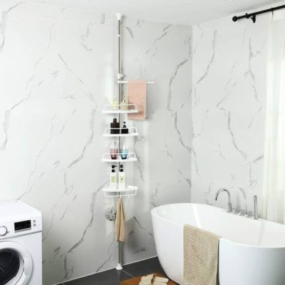 állítható fürdőszobai sarokpolc, teleszkópos zuhanykabin, 95-300 cm, padlótól mennyezetig, rozsdamentes acél kerettel, 4 tálcával, 3 kampóval, 1 törülközőtartóval, fehér és ezüst