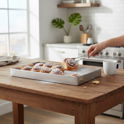 A 34×22,5×3,5 cm-es alumínium tepsi mérete miatt sokoldalúan bevethető: húsokhoz, zöldségekhez, rakott ételekhez és süteményekhez egyaránt. Az alumínium kivételes hővezető képessége gyors és egyenletes sütést biztosít, így ropogós kéreg és szaftos belső érhető el.