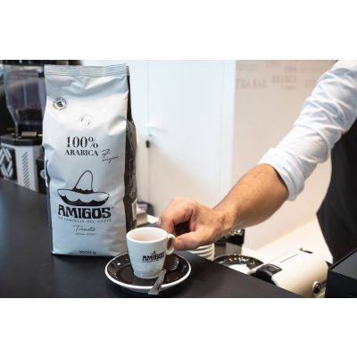 Minőségi olasz gyártmányú espresso fehér porcelán csésze, az Amigos új fekete logójával és választható színű aljjal, piros, fehér vagy fekete színekben.