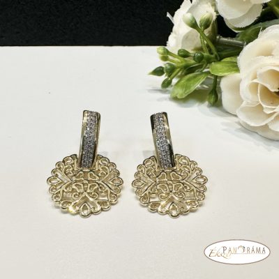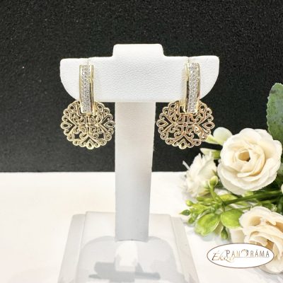 14K Gold Filled anti-allergén, nikkel és ólom mentes, arany színű fülbevaló, kristályokkal és különleges mintázattal díszítve.