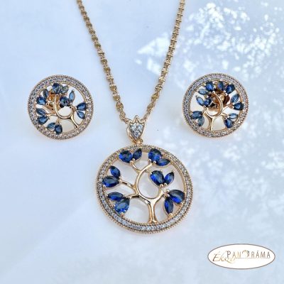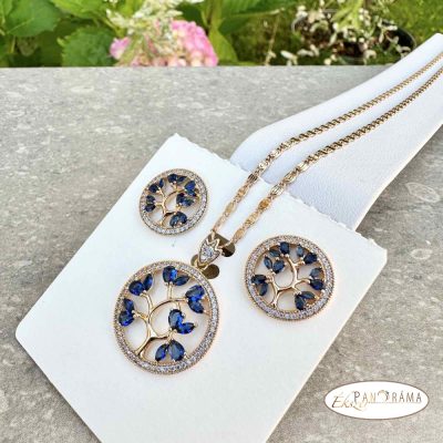 18K Gold Filled anti-allergén szett, sötétkék kristályokkal díszített életfa medálos nyaklánccal és beszúrós, stiftes fülbevalóval.