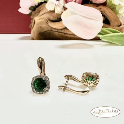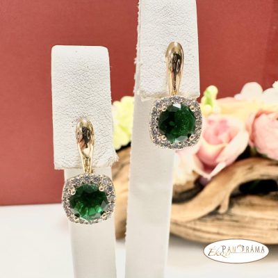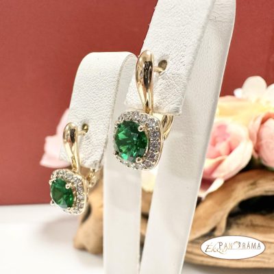 Antiallergén, nikkel és ólom mentes fülbevaló, arany színű, zöld kristállyal díszítve.