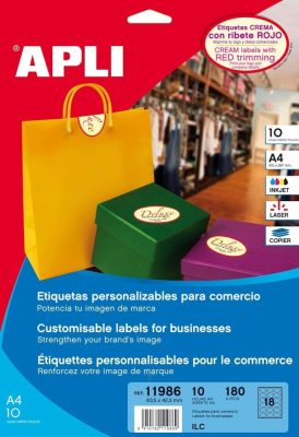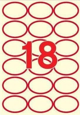 APLI 63,5 x 42,3 mm méretű, ovális alakú, krémszínű, matt felületű, univerzális öntapadós etikett címke, piros színű kerettel, A4-es lapon, permanens ragasztóval. Rendelési azonosító: APLI 11986.