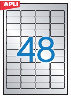 APLI No. 12973 ezüst színű 45,7 x 21,2 mm méretű, lézernyomtatóval nyomtatható, öntapadós ipari etikett címke, erős, tartós ragasztóval A4-es íven - kiszerelés: 4800 címke / 100 ív (LCA12973)
