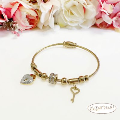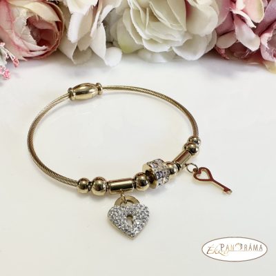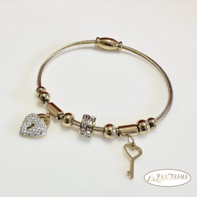 Nemesacél aranyozott karkötő kristályokkal, mágnes zárral, kristályos szívvel és kulcs medállal