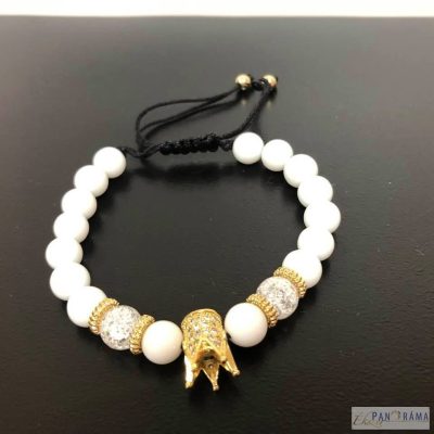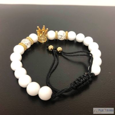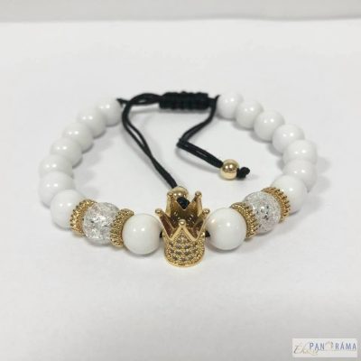 Fehér színű, ásványokból álló divat karkötő korona alakú medállal és acél szerelékkel.