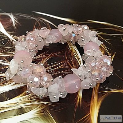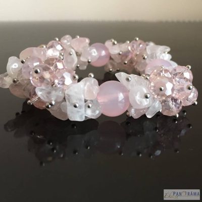 Fehér és áttetsző ásványból fűzött széles divatos gumis karkötő!