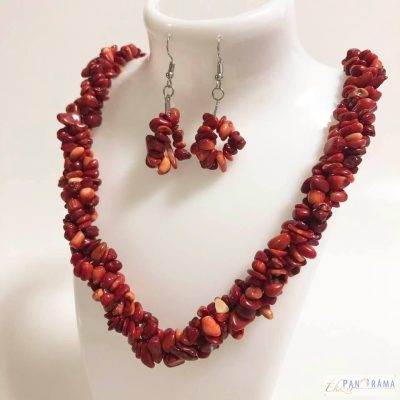 Bordó és piros színű ásványokkal díszített több soros divatos nyakék és fülbevaló szett.
