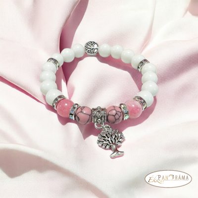 Ásványkő karkötő, kézzel készített Jade - fehér és rózsaszín gyöngyök ezüst fém és strassz díszítéssel és életfa medállal