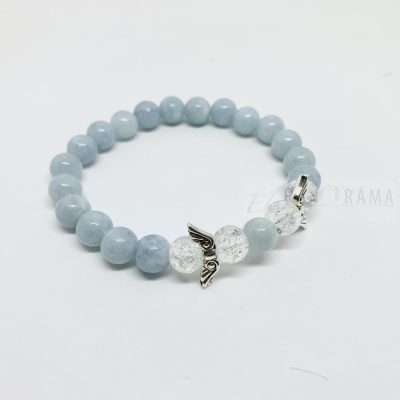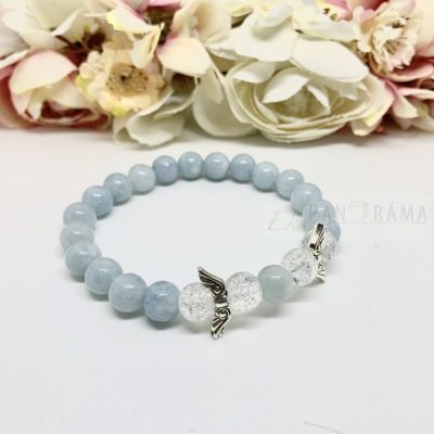 Akvamarin, ásvány gyöngyökből álló szteccs karkötő angyalszárny díszítéssel. Igazán mutatós és úgy vélhető, hogy a szervezetre is jó hatással bír!