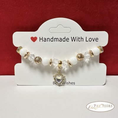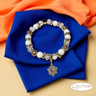 Ásványkő sztreccs karkötő fehér Jade ásványokkal,arany gyöngyökkel, 1 kristályos szív medál díszítéssel!