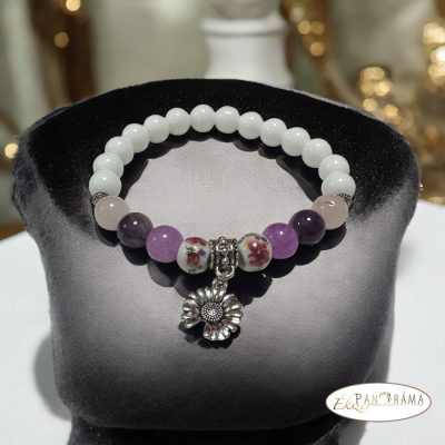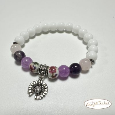 Ásványkő sztreccs karkötő fehér Jade és ametist ásványokkal, festett kerámia gyöngy és virág medál díszítéssel!