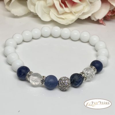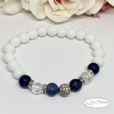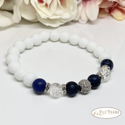 Fehér Jade ásvány sötétkék kővel és kristályokkal díszített karkötő gumis alapon. Eleganciát sugárzó szép darab!