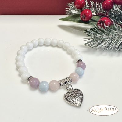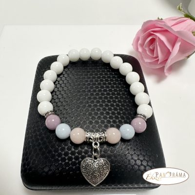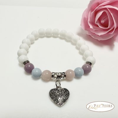 Ásványkő sztreccs karkötő fehér Jade és más színes ásványokkal, szív ezüst medállal.