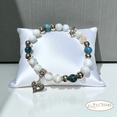 Ásványkő sztreccs karkötő Kalcedon és Apatit ásványokkal, ezöst színű betétekkel és medállal díszített! díszített!