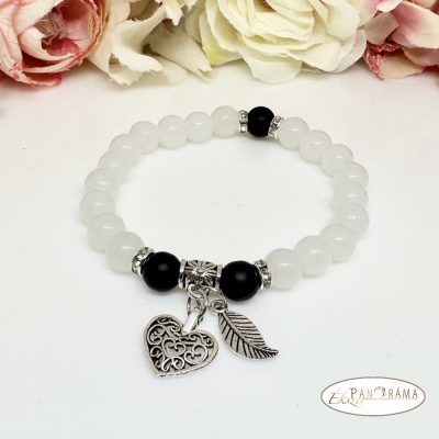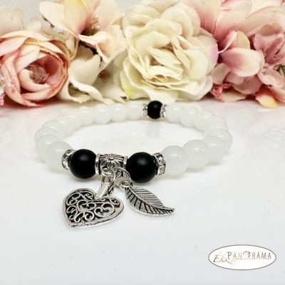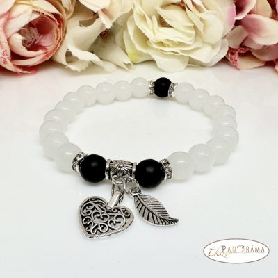 Ásványkő sztreccs karkötő tejkvarc és fekete ónix gyöngyökből, medál díszítéssel! Igény esetén díszdobozban szállítjuk.