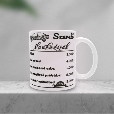 Ez a bögre azonnal mosolyt csal az arcodra. Az árlista olyan poénokat tartalmaz, mint az "Alap - 3000 Forint", "Ha nézed - 4000 Forint", "Ha tanácsot adsz - 5000 Forint", "Ha segíteni próbálsz - 8000 Forint" vagy "Ha már mókultad - 15.000 Forint". Ezek a vicces tételsorok valóban felmelegítik a műhelyhangulatot és a jókedvet.