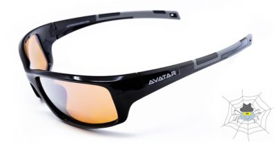 Sportnapszemüveg borostyánszínű HD lencsével, fekete műanyag kerettel.