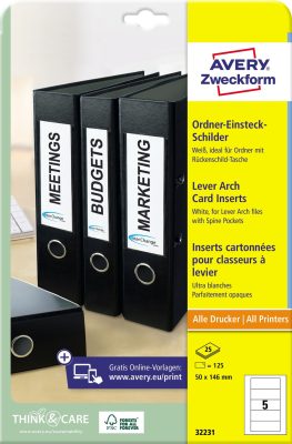 Avery Zweckform No. 32231 fehér színű 146 x 50 mm méretű, univerzálisan nyomtatható iratrendező betétlap, mikroperforált élekkel A4-es íven - kiszerelés: 125 betétlap / 25 ív