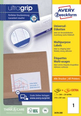 • Avery Zweckform No. 3478-200 fehér színű 210 x 297 mm méretű, univerzálisan nyomtatható, öntapadós etikett címke, permanens ragasztóval A4-es íven - kiszerelés: 220 címke / 220 ív