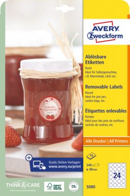 • Avery Zweckform No. 5080 fehér színű 40 mm átmérőjű, kör alakú, univerzálisan nyomtatható, öntapadós etikett címke, visszaszedhető ragasztóval A4-es íven - kiszerelés: 240 címke / 10 ív